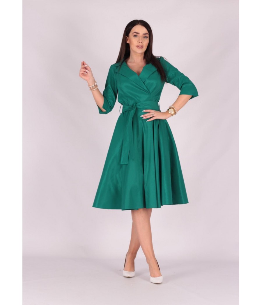 Zjawiskowa sukienka w kolorze zieleni w najmodniejszej długości midi z kieszeniami po bokach. Góra sukienki, dekolt w serek wykończony pięknym kołnierzem, mocno zaznaczona talia, rękaw w długości 3/4. Jeżeli chcesz wyglądać na imprezie wyjątkowo zdecydowanie postaw na ten szalenie kobiecy model.