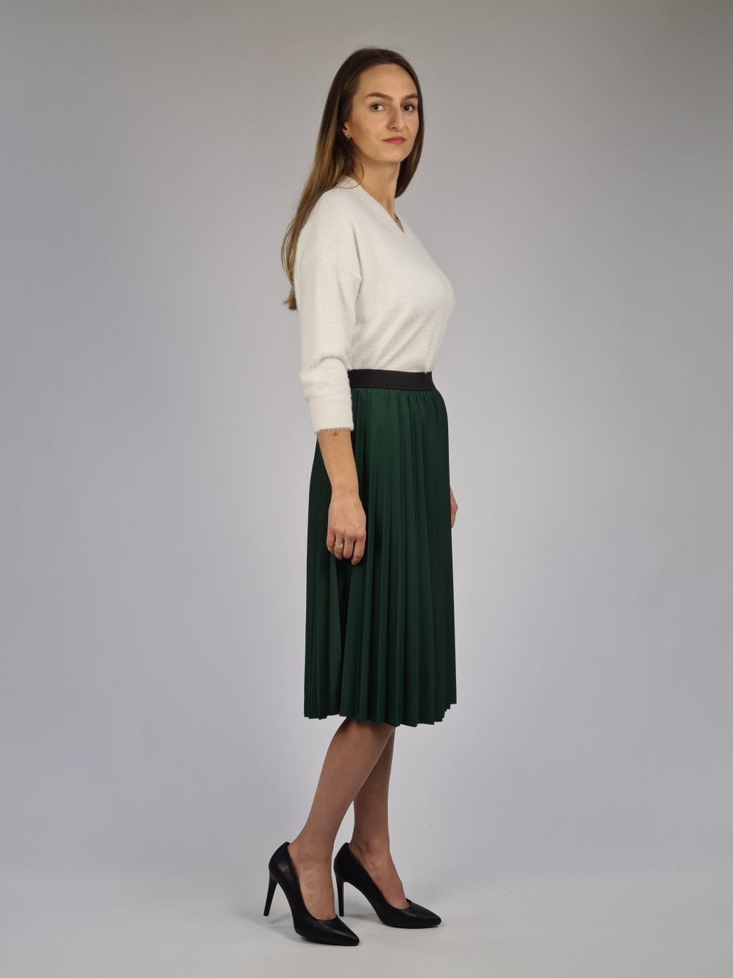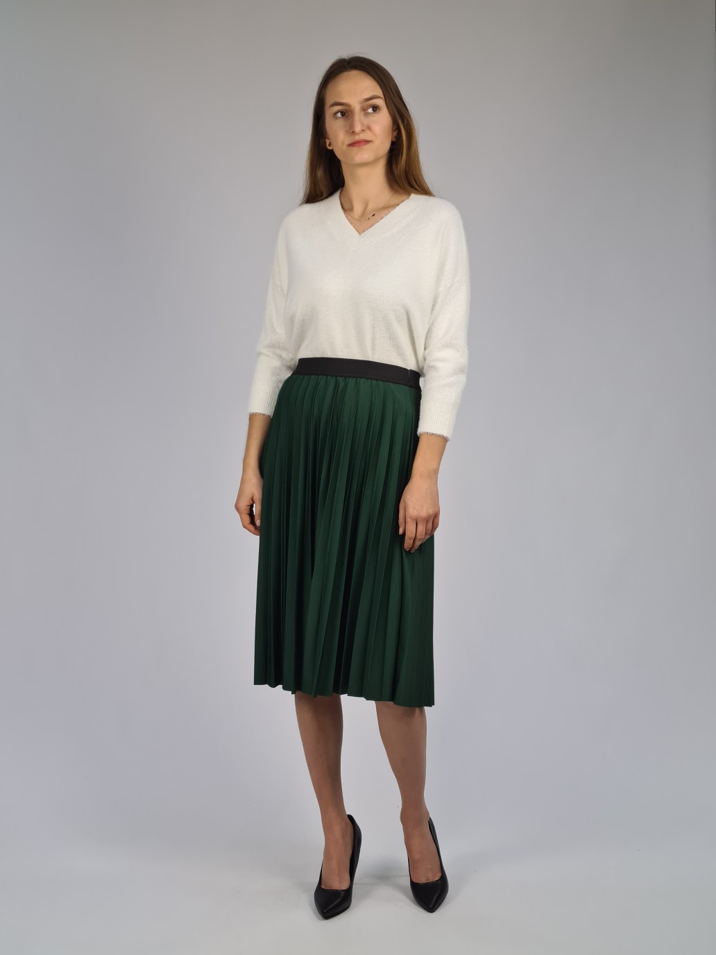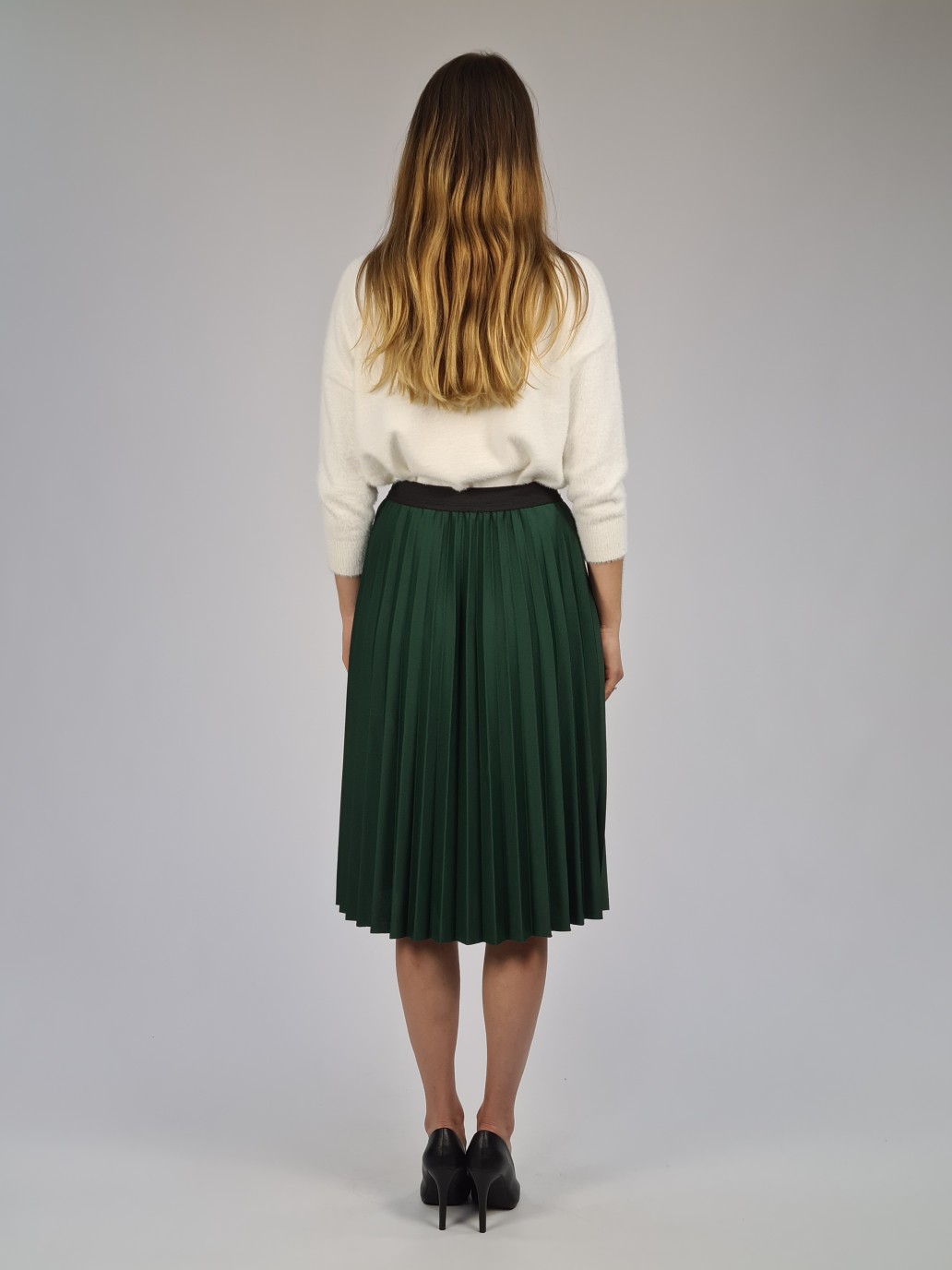 Gładka, szeroka dołem spódnica tuż za kolano, z plisowanego materiału, butelkowa zieleń. Bardzo elastyczna, ozdobna gumka w pasie, dopasowuje się do rozmiaru talii. Spódnica w romantycznym stylu, na każdą okazję. Zwiewna, bardzo kobieca. Rozmiar uniwersalny 36/38/40.