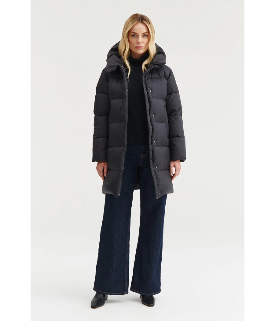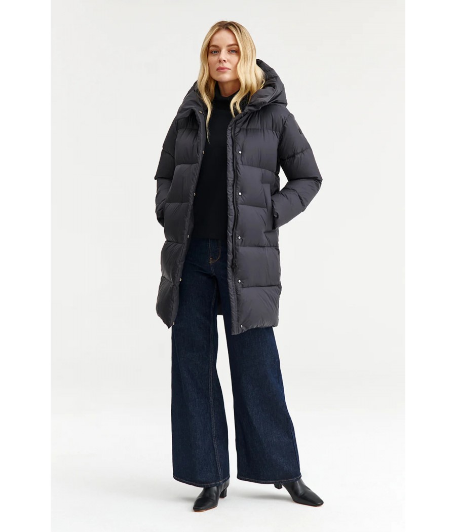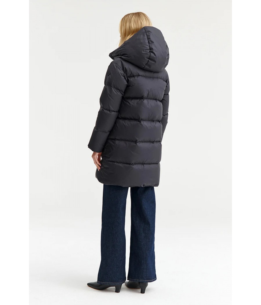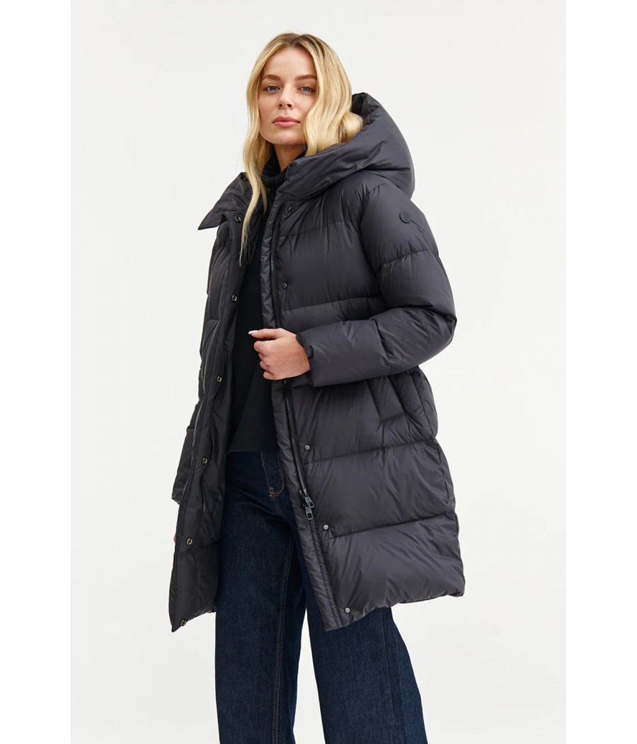 Kurtka średniej długości zapinana na dwukierunkowy suwak. Duży otulający kaptur.