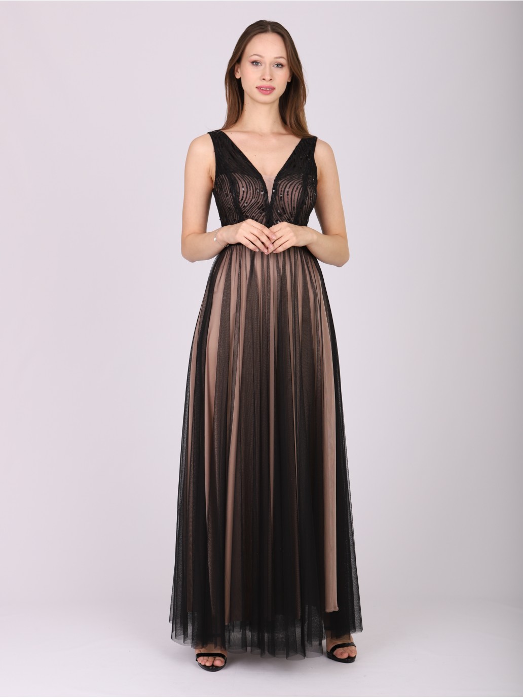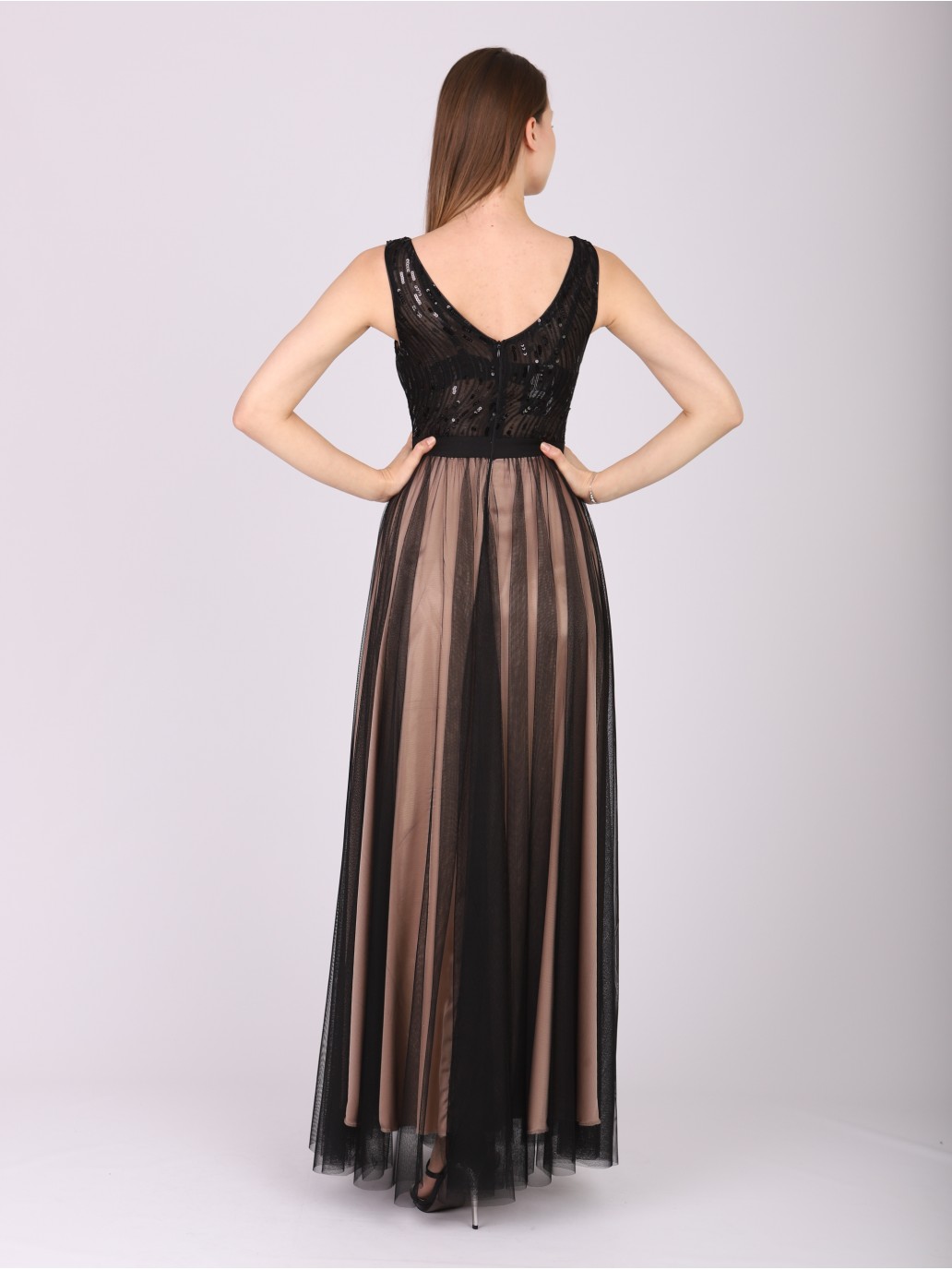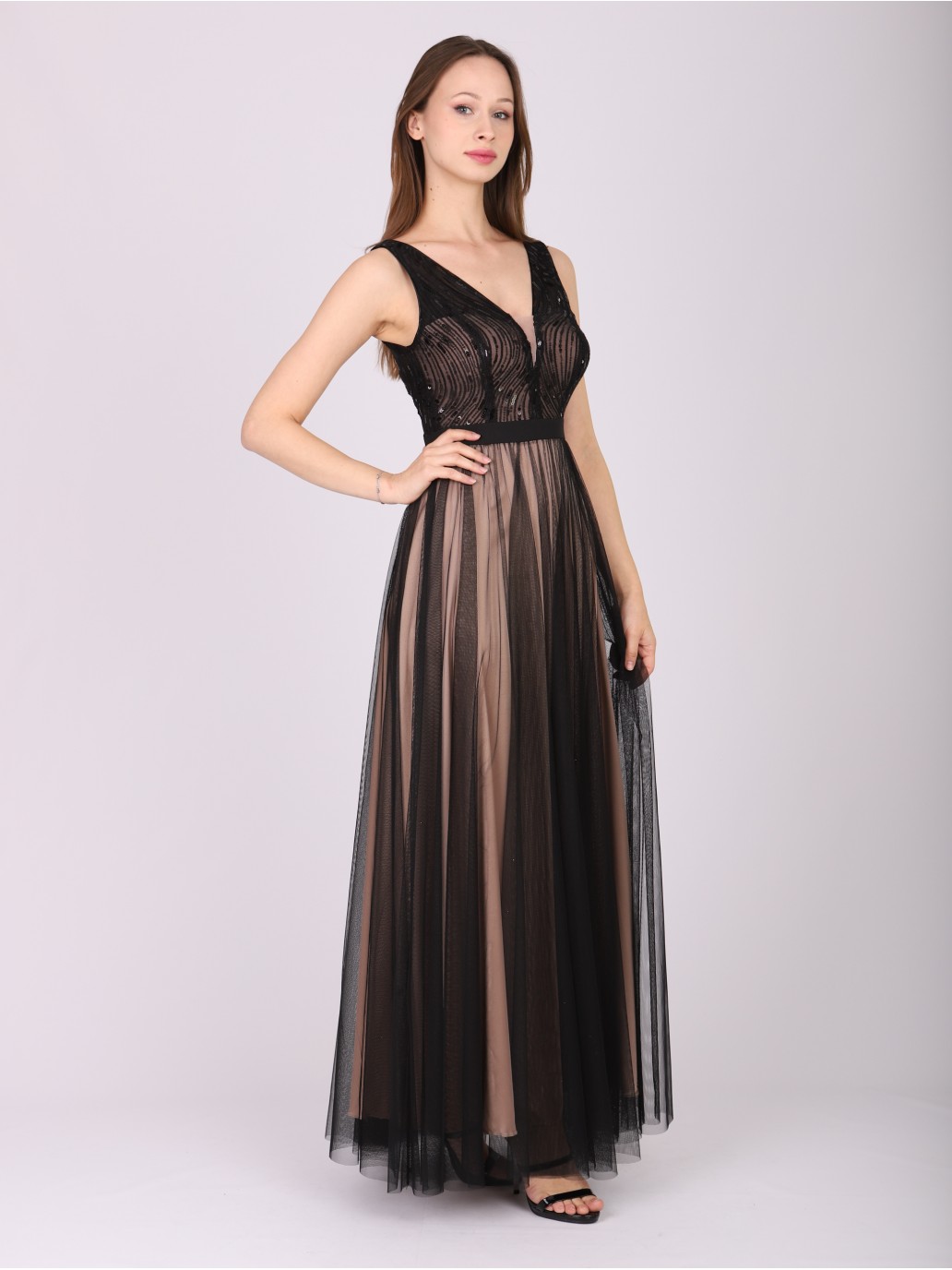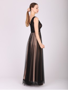 Romantyczna, piękna czarna sukienka z cielistym podbiciem na całości sukienki z dekoltem w serek z ciekawymi drobnymi cekinami zdobionymi górą gorsetu w pasie namarszczona dół z prześwitującego tiulu bardzo kobieca podkreśla kobiece walory, sukienka bardzo romantyczna. Zaufaj a nie zawiedziemy Cię będziesz królową balu.